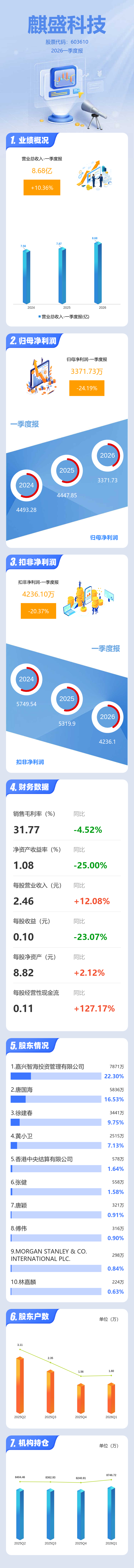 证券之星消息,麒盛科技2026年一季报显示,一季度公司主营收入8.68亿元,同比上升10.37%;归母净利润3371.73万元,同比下降24.19%;扣非净利润4236.1万元,同比下降20.37%;负债率36.7%,投资收益111.8万元,财务费用2729.34万元,毛利率31.77%。