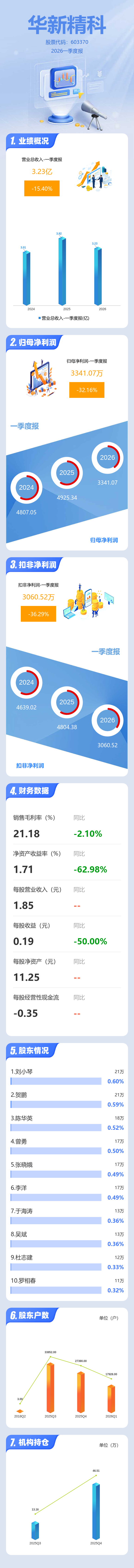 证券之星消息,华新精科2026年一季报显示,一季度公司主营收入3.23亿元,同比下降15.41%;归母净利润3341.07万元,同比下降32.17%;扣非净利润3060.52万元,同比下降36.3%;负债率24.77%,投资收益112.55万元,财务费用325.79万元,毛利率21.18%。