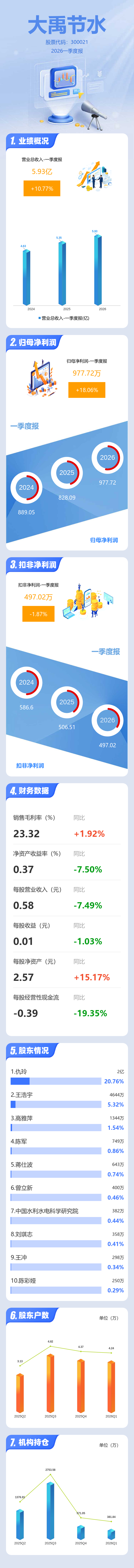 证券之星消息,大禹节水2026年一季报显示,一季度公司主营收入5.93亿元,同比上升10.78%;归母净利润977.72万元,同比上升18.07%;扣非净利润497.02万元,同比下降1.87%;负债率71.22%,投资收益-327.31万元,财务费用2415.18万元,毛利率23.32%。