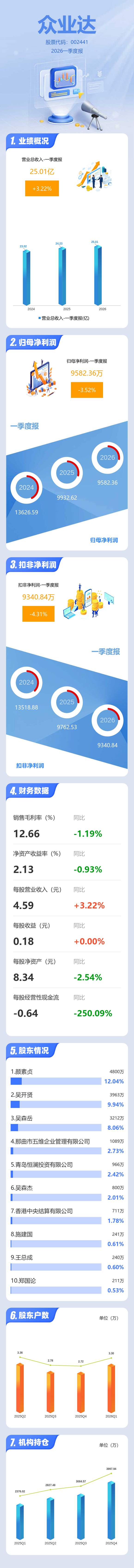 证券之星消息,众业达2026年一季报显示,一季度公司主营收入25.01亿元,同比上升3.22%;归母净利润9582.36万元,同比下降3.53%;扣非净利润9340.84万元,同比下降4.32%;负债率33.42%,投资收益265.28万元,财务费用-931.13万元,毛利率12.66%。