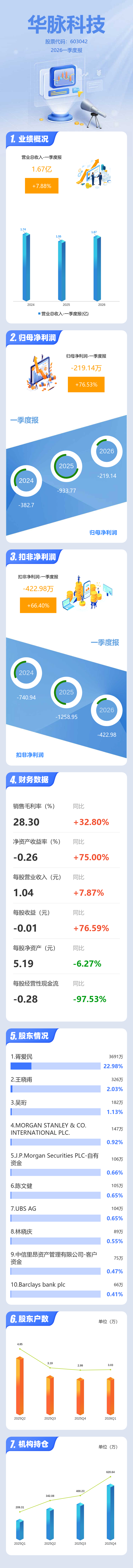 证券之星消息,华脉科技2026年一季报显示,一季度公司主营收入1.67亿元,同比上升7.88%;归母净利润-219.14万元,同比上升76.53%;扣非净利润-422.98万元,同比上升66.4%;负债率45.32%,投资收益31.79万元,财务费用211.95万元,毛利率28.3%。