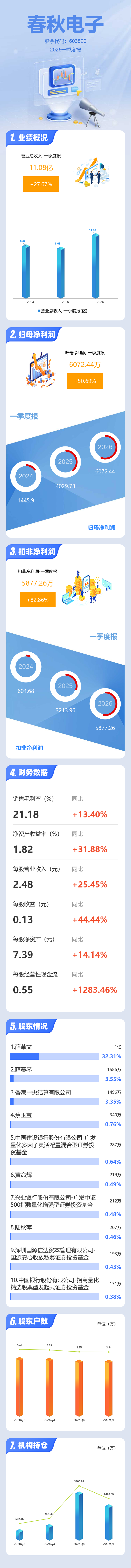 证券之星消息,春秋电子2026年一季报显示,一季度公司主营收入11.08亿元,同比上升27.67%;归母净利润6072.44万元,同比上升50.69%;扣非净利润5877.26万元,同比上升82.87%;负债率50.84%,投资收益-208.27万元,财务费用4492.1万元,毛利率21.18%。