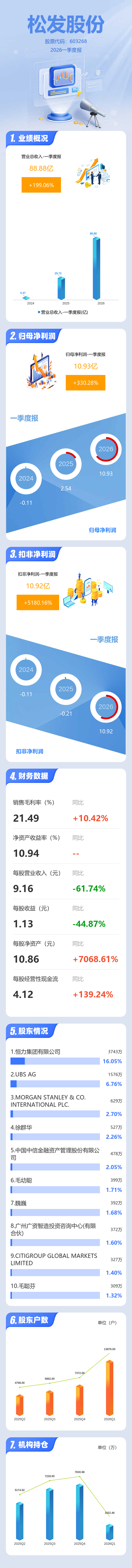 证券之星消息,松发股份2026年一季报显示,一季度公司主营收入88.88亿元,同比上升199.07%;归母净利润10.93亿元,同比上升330.29%;扣非净利润10.92亿元,同比上升5180.16%;负债率81.49%,投资收益119.37万元,财务费用3.16亿元,毛利率21.49%。
