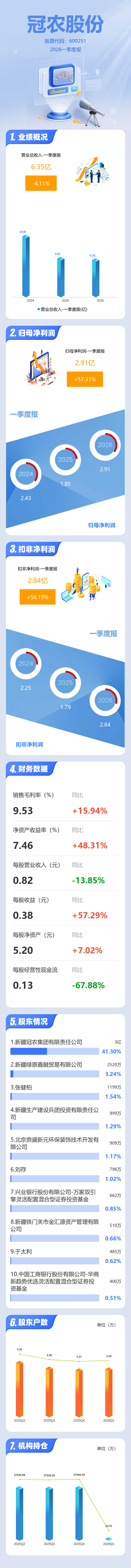 证券之星消息,冠农股份2026年一季报显示,一季度公司主营收入6.35亿元,同比下降4.11%;归母净利润2.91亿元,同比上升57.31%;扣非净利润2.84亿元,同比上升58.19%;负债率42.19%,投资收益2.85亿元,财务费用1159.69万元,毛利率9.53%。