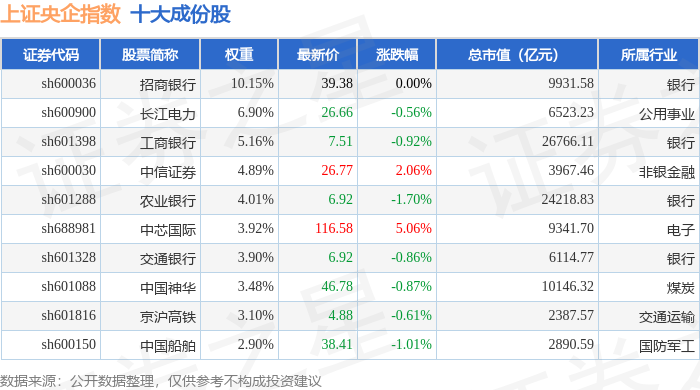 证券之星消息,4月27日,上证央企(000042)指数报收于1760.31点,跌0.06%,成交699.92亿元,换手率0.27%。当日该指数成份股中,上涨的有16家,中芯国际以5.06%的涨幅领涨,下跌的有33家,中国能建以2.07%的跌幅领跌。