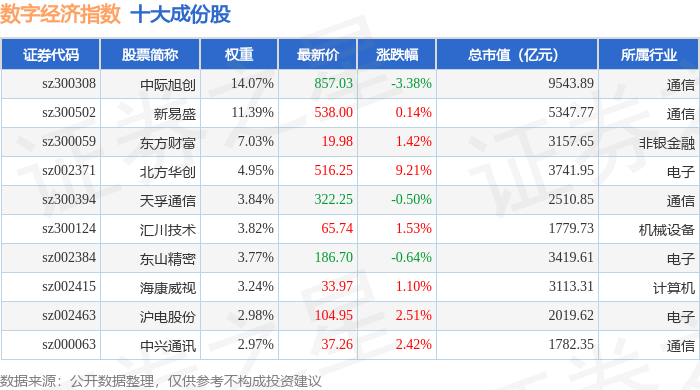 数字经济(399262)指数十大成份股详情如下: