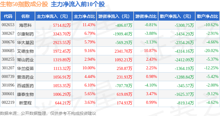 资金流向方面,生物50(399280)指数成份股当日主力资金净流出合计7.94亿元,游资资金净流入合计3.75亿元,散户资金净流入合计4.18亿元。成份股资金流向详情见下表: