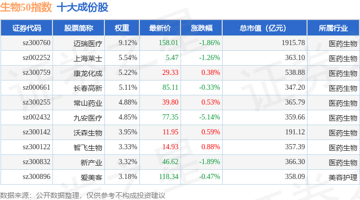 证券之星消息,4月27日,生物50(399280)指数报收于1925.88点,跌0.23%,成交145.58亿元,换手率1.83%。当日该指数成份股中,上涨的有29家,九强生物以8.1%的涨幅领涨,下跌的有20家,九安医疗以5.14%的跌幅领跌。