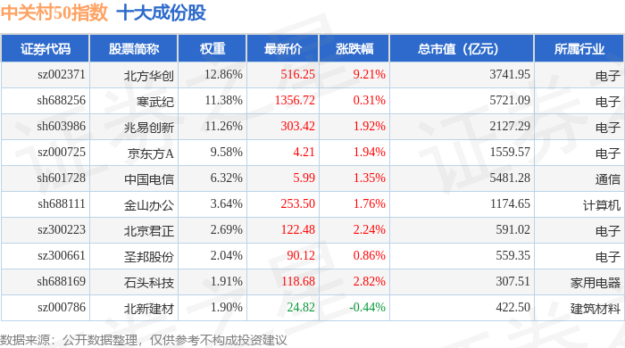 中关村50(399423)指数十大成份股详情如下: