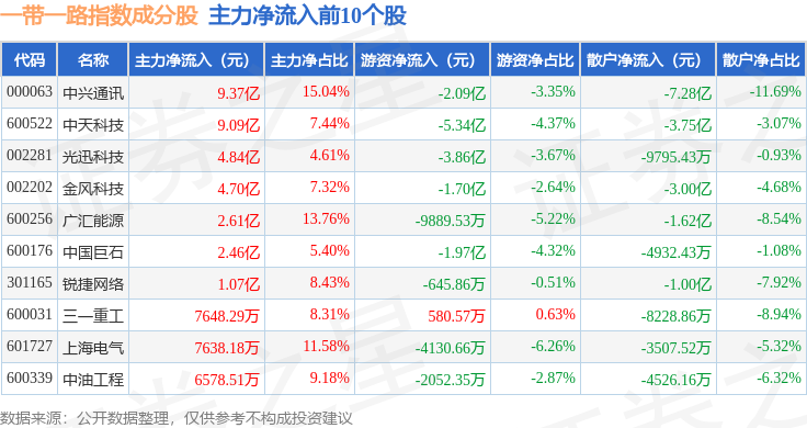 资金流向方面,一带一路(399991)指数成份股当日主力资金净流出合计92.57亿元,游资资金净流入合计49.26亿元,散户资金净流入合计43.31亿元。成份股资金流向详情见下表: