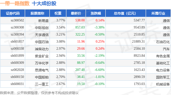一带一路(399991)指数十大成份股详情如下: