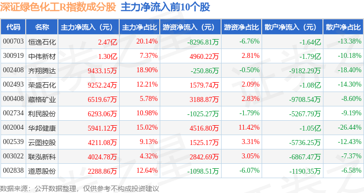 资金流向方面,深证绿色化工R(470076)指数成份股当日主力资金净流出合计18.98亿元,游资资金净流入合计15.19亿元,散户资金净流入合计3.79亿元。成份股资金流向详情见下表: