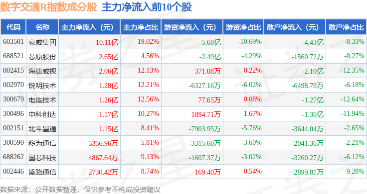 资金流向方面,数字交通R(480075)指数成份股当日主力资金净流入合计12.45亿元,游资资金净流出合计8.82亿元,散户资金净流出合计3.63亿元。成份股资金流向详情见下表: