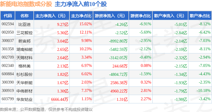 资金流向方面,新能电池(980032)指数成份股当日主力资金净流出合计27.72亿元,游资资金净流入合计16.08亿元,散户资金净流入合计11.44亿元。成份股资金流向详情见下表: