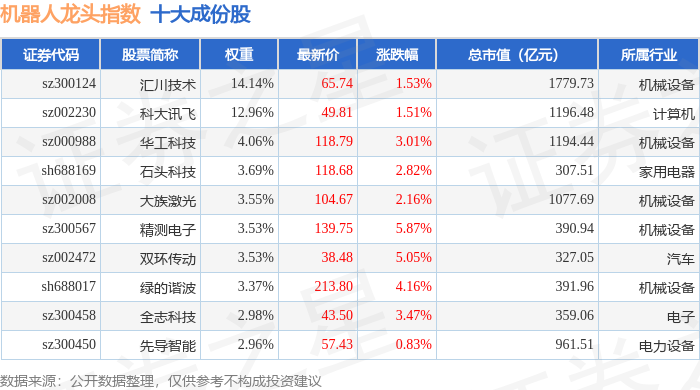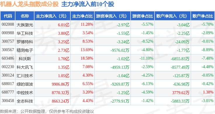 资金流向方面,机器人龙头(980071)指数成份股当日主力资金净流入合计21.13亿元,游资资金净流出合计17.13亿元,散户资金净流出合计4.0亿元。成份股资金流向详情见下表: