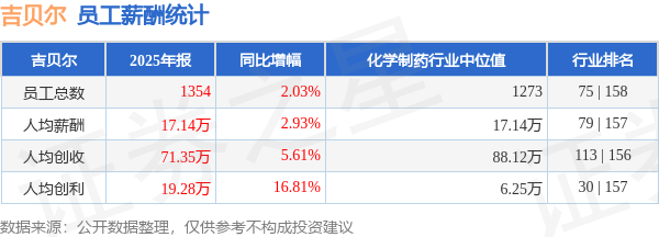 证券之星消息,4月28日吉贝尔公布2025年年报,当年营收9.66亿元,同比增7.76%;净利润为2.62亿元,同比增19.28%。根据财报数据披露,当年公司员工总数1354人,同比增2.03%;人均薪酬17.14万元,同比增2.93%;人均创收71.35万元,同比增5.61%;人均创利19.28万元,同比增16.81%;公司员工薪酬统计见下表: