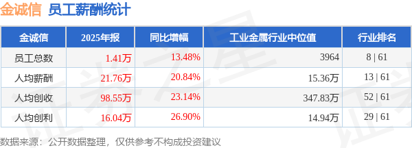 证券之星消息,4月28日金诚信公布2025年年报,当年营收138.94亿元,同比增39.74%;净利润为23.39亿元,同比增47.66%。根据财报数据披露,当年公司员工总数14099人,同比增13.48%;人均薪酬21.76万元,同比增20.84%;人均创收98.55万元,同比增23.14%;人均创利16.04万元,同比增26.9%;公司员工薪酬统计见下表: