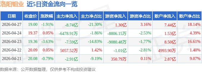 证券之星消息,截至2026年4月27日收盘,洛阳钼业(603993)报收于19.0元,下跌1.91%,换手率1.23%,成交量215.01万手,成交额41.01亿元。