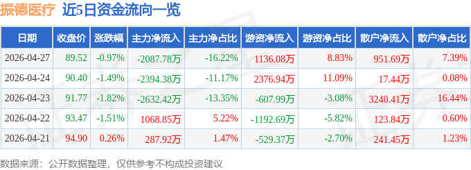 证券之星消息,截至2026年4月27日收盘,振德医疗(603301)报收于89.52元,下跌0.97%,换手率0.54%,成交量1.44万手,成交额1.29亿元。