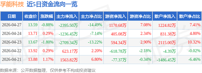证券之星消息,截至2026年4月27日收盘,孚能科技(688567)报收于13.59元,下跌0.88%,换手率1.0%,成交量12.19万手,成交额1.65亿元。