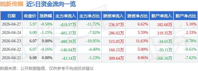 证券之星消息,截至2026年4月27日收盘,皖新传媒(601801)报收于5.97元,下跌0.5%,换手率0.31%,成交量6.0万手,成交额3578.94万元。