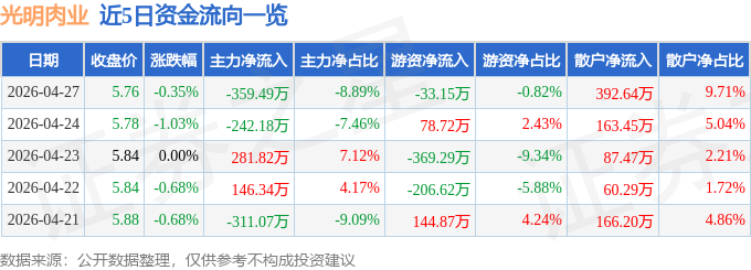 证券之星消息,截至2026年4月27日收盘,光明肉业(600073)报收于5.76元,下跌0.35%,换手率0.75%,成交量7.06万手,成交额4044.11万元。