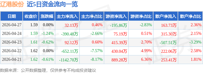 证券之星消息,截至2026年4月27日收盘,辽港股份(601880)报收于1.59元,上涨0.0%,换手率0.24%,成交量43.46万手,成交额6925.78万元。