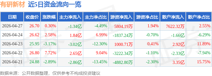 4月27日的资金流向数据方面,主力资金净流出1.34亿元,占总成交额4.49%,游资资金净流入5804.19万元,占总成交额1.94%,散户资金净流入7622.32万元,占总成交额2.55%。