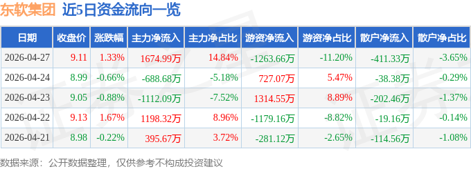 证券之星消息,截至2026年4月27日收盘,东软集团(600718)报收于9.11元,上涨1.33%,换手率1.04%,成交量12.5万手,成交额1.13亿元。