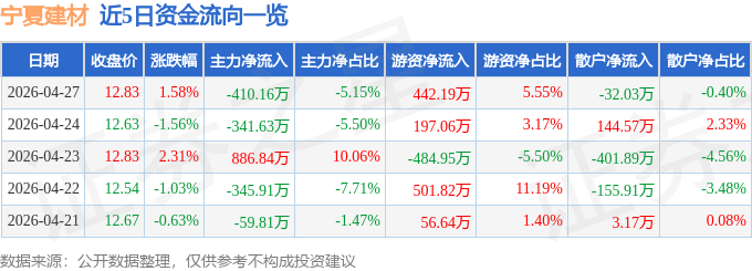 证券之星消息,截至2026年4月27日收盘,宁夏建材(600449)报收于12.83元,上涨1.58%,换手率1.31%,成交量6.24万手,成交额7970.66万元。