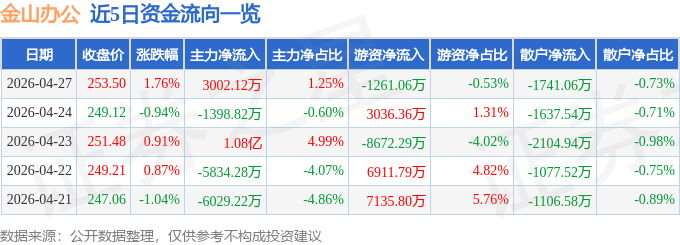 证券之星消息,截至2026年4月27日收盘,金山办公(688111)报收于253.5元,上涨1.76%,换手率2.05%,成交量9.49万手,成交额23.94亿元。