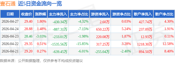 证券之星消息,截至2026年4月27日收盘,壹石通(688733)报收于29.4元,上涨1.8%,换手率1.7%,成交量3.4万手,成交额9954.88万元。