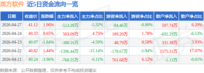 证券之星消息,截至2026年4月27日收盘,英方软件(688435)报收于41.12元,上涨1.96%,换手率4.22%,成交量2.36万手,成交额9642.22万元。