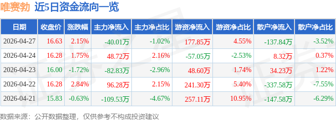 证券之星消息,截至2026年4月27日收盘,唯赛勃(688718)报收于16.63元,上涨2.15%,换手率1.37%,成交量2.38万手,成交额3912.37万元。