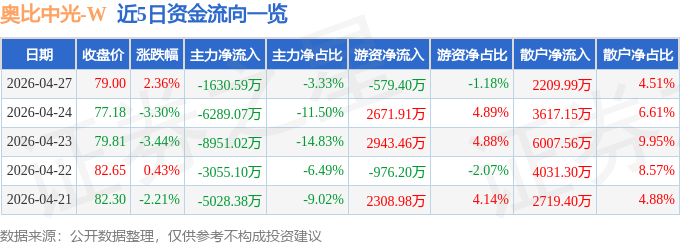 证券之星消息,截至2026年4月27日收盘,奥比中光(688322)报收于79.0元,上涨2.36%,换手率1.94%,成交量6.19万手,成交额4.9亿元。