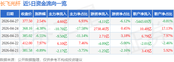 证券之星消息,截至2026年4月27日收盘,长飞光纤(601869)报收于377.5元,上涨2.54%,换手率4.32%,成交量17.54万手,成交额67.26亿元。
