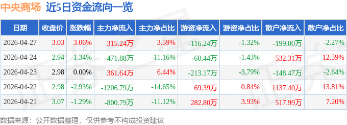 证券之星消息,截至2026年4月27日收盘,中央商场(600280)报收于3.03元,上涨3.06%,换手率2.61%,成交量29.4万手,成交额8778.87万元。