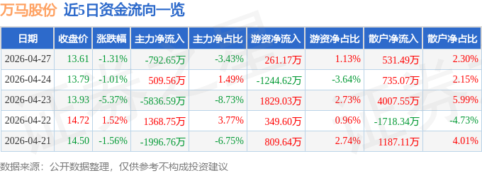 证券之星消息,截至2026年4月27日收盘,万马股份(002276)报收于13.61元,下跌1.31%,换手率1.68%,成交量16.96万手,成交额2.31亿元。