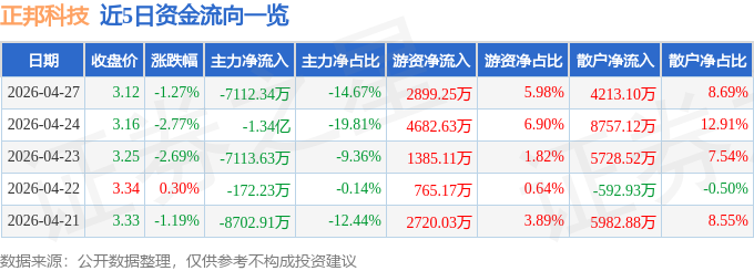 证券之星消息,截至2026年4月27日收盘,正邦科技(002157)报收于3.12元,下跌1.27%,换手率2.15%,成交量155.83万手,成交额4.85亿元。