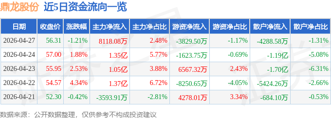 证券之星消息,截至2026年4月27日收盘,鼎龙股份(300054)报收于56.31元,下跌1.21%,换手率7.64%,成交量56.37万手,成交额32.7亿元。