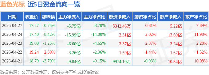 证券之星消息,截至2026年4月27日收盘,蓝色光标(300058)报收于17.27元,下跌0.75%,换手率10.94%,成交量380.34万手,成交额66.07亿元。