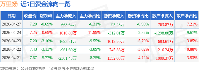 证券之星消息,截至2026年4月27日收盘,万里扬(002434)报收于7.2元,下跌0.69%,换手率1.12%,成交量14.72万手,成交额1.06亿元。