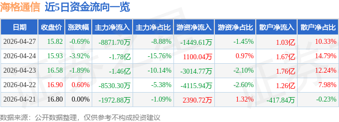 证券之星消息,截至2026年4月27日收盘,海格通信(002465)报收于15.82元,下跌0.69%,换手率2.56%,成交量63.33万手,成交额9.99亿元。