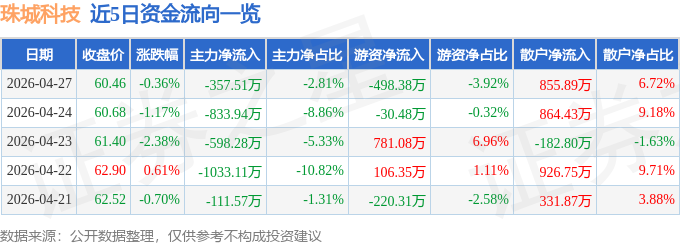 证券之星消息,截至2026年4月27日收盘,珠城科技(301280)报收于60.46元,下跌0.36%,换手率5.28%,成交量2.12万手,成交额1.27亿元。