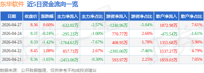 证券之星消息,截至2026年4月27日收盘,东华软件(002065)报收于8.36元,上涨0.6%,换手率1.02%,成交量29.6万手,成交额2.46亿元。