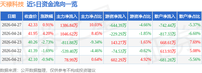 证券之星消息,截至2026年4月27日收盘,天禄科技(301045)报收于42.33元,上涨0.91%,换手率4.78%,成交量3.33万手,成交额1.38亿元。