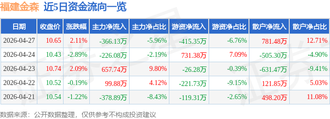 证券之星消息,截至2026年4月27日收盘,福建金森(002679)报收于10.65元,上涨2.11%,换手率2.49%,成交量5.88万手,成交额6146.76万元。