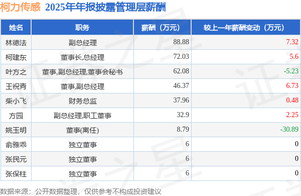 证券之星消息,柯力传感发布2025年年报,数据显示:公司主营收入15.58亿元,同比增20.33%。归母净利润为3.41亿元,同比增30.73%。扣非净利润为2.14亿元,同比增11.06%。当年公司员工总数2967人,同比增8.96%。人均薪酬12.46万元(注:"人均薪酬"根据定期报告中"应付职工薪酬"附注的本期增加值 / 员工总数计算而来),同比增11.14%。人均创收52.53万元,同比增10.44%。人均创利13.19万元,同比增17.64%。其中管理层薪酬总额为367.01万元,同比上一年减14.71%,薪酬最高的为副总经理林德法,薪酬88.88万元。