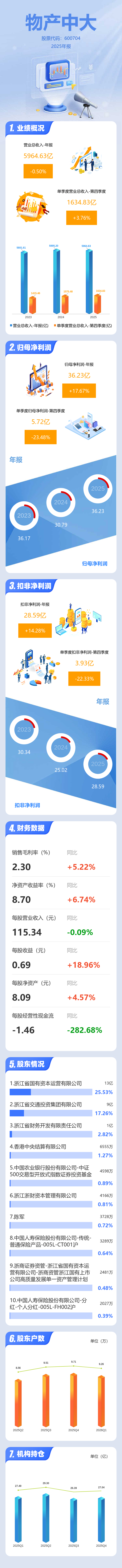 证券之星消息,物产中大2025年年报显示,当年度公司主营收入5964.63亿元,同比下降0.51%;归母净利润36.23亿元,同比上升17.68%;扣非净利润28.59亿元,同比上升14.28%;其中2025年第四季度,公司单季度主营收入1634.83亿元,同比上升3.77%;单季度归母净利润5.72亿元,同比下降23.48%;单季度扣非净利润3.93亿元,同比下降22.34%;负债率69.65%,投资收益42.52亿元,财务费用15.99亿元,毛利率2.3%。