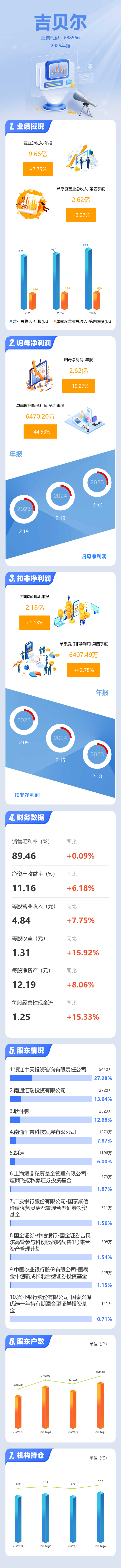 证券之星消息,吉贝尔2025年年报显示,当年度公司主营收入9.66亿元,同比上升7.76%;归母净利润2.62亿元,同比上升19.28%;扣非净利润2.18亿元,同比上升1.13%;其中2025年第四季度,公司单季度主营收入2.62亿元,同比上升3.28%;单季度归母净利润6470.2万元,同比上升44.54%;单季度扣非净利润6407.49万元,同比上升42.78%;负债率9.84%,投资收益-264.4万元,财务费用-538.81万元,毛利率89.46%。